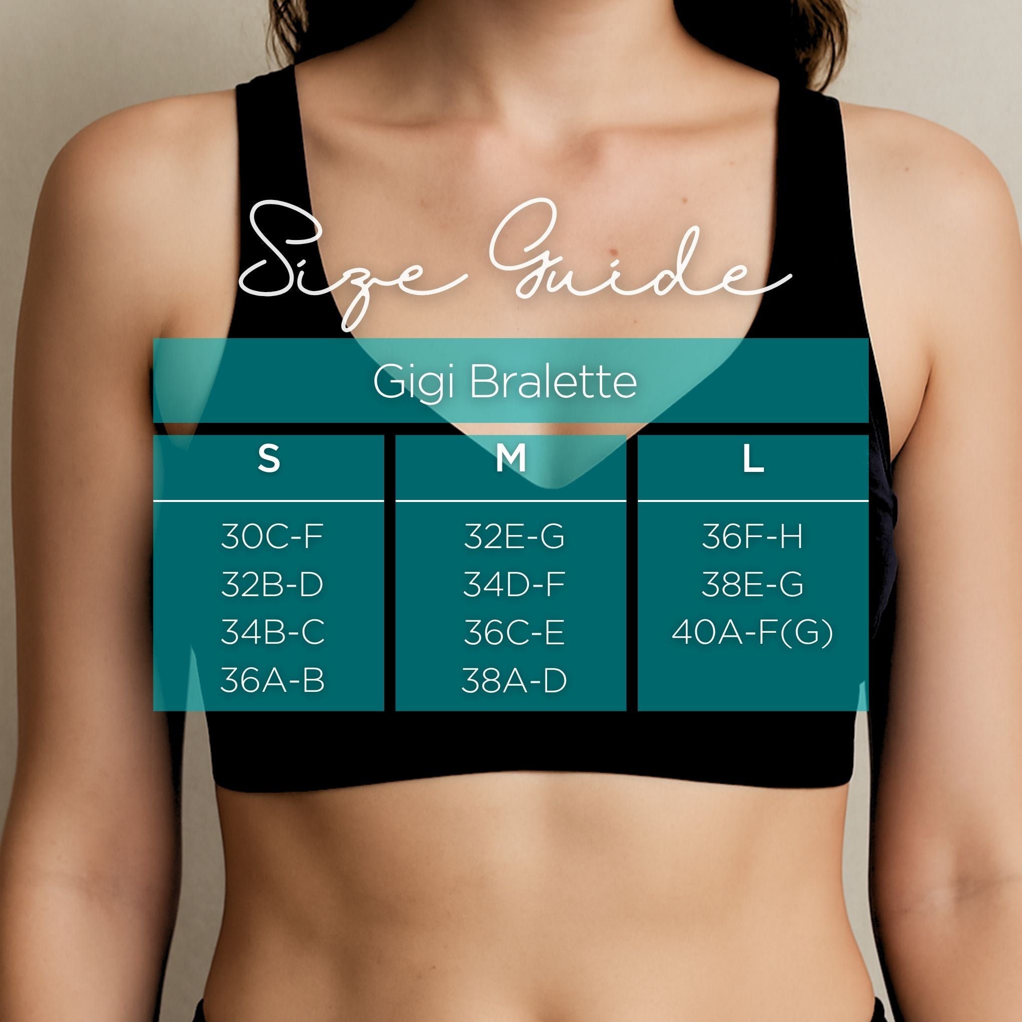 Full coverage for fuller busts (34C-40F). Not an underwire replacement - Gigi is designed to let the girls breathe while you take deep breaths. Gently supportive, never constricted.